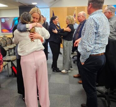 Mayor Susan O’Regan hugs Dale-Maree Morgan after the vote.