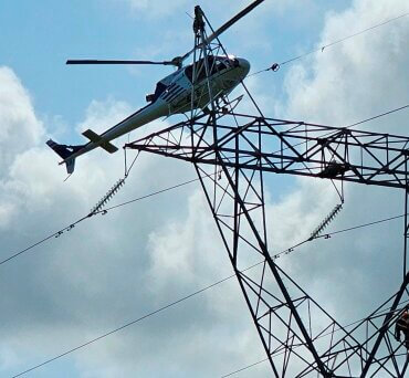 Waiting on the towers were contracted staff who caught the wires pulled by the helicopter.