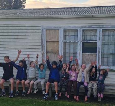 Karapiro school children outside the old building which Waipa District Council wants to demolish.