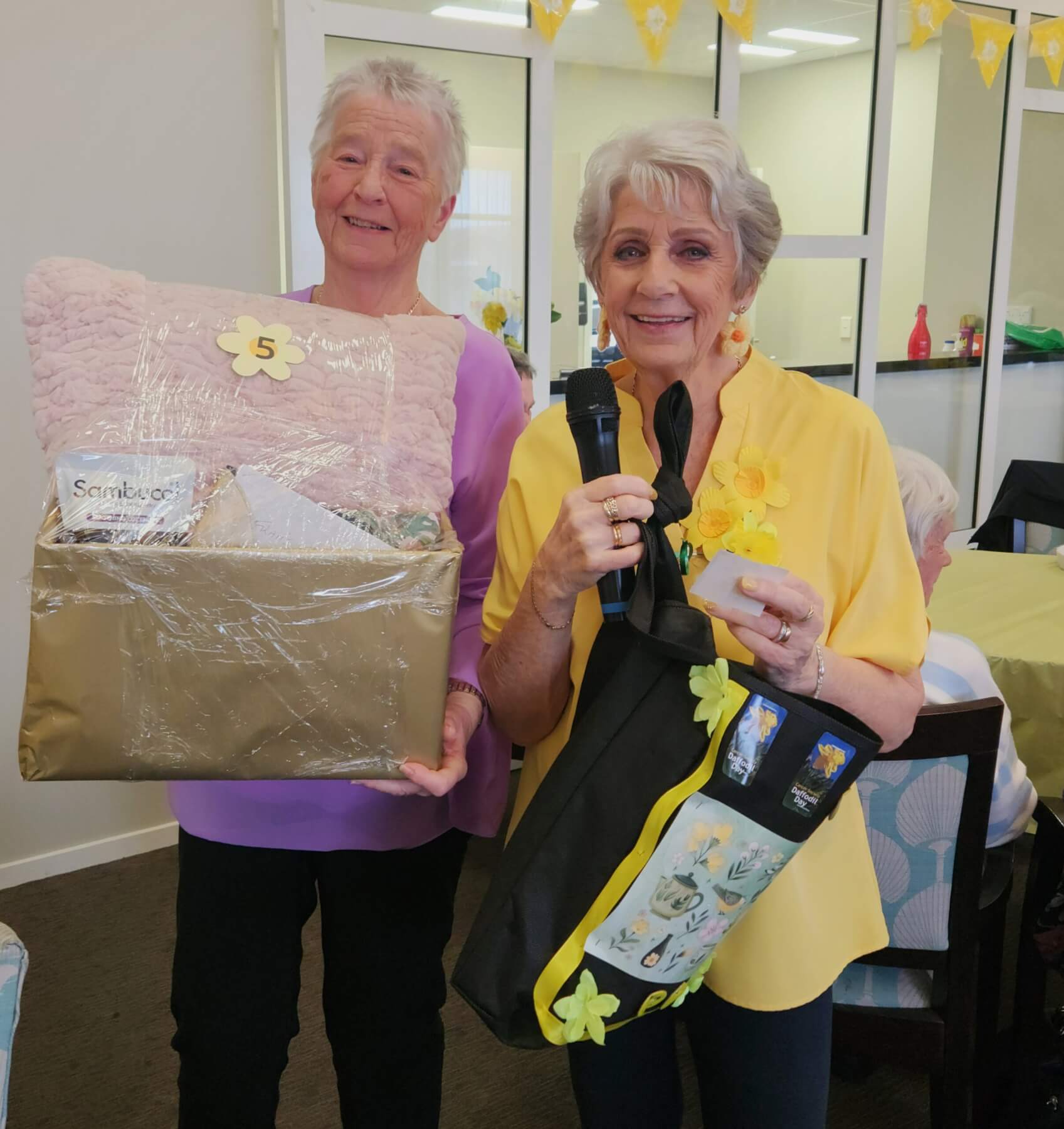 - Cambridge Resthaven resident Annette Watkinson pictured with her raffle winnings, presented by the raffle and event organiser, Linda Gorham. Photo: supplied