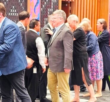 Waikato University’s Pacific assistant vice chancellor Keakaokawai Varner Hemi, right alongside Tom Roa (Ngāti Maniapoto, Waikato, Ngāti Apakura), professor of Te Pua Wananga ki te Ao – Faculty of Māori and Indigenous Studies were present at the signing with from left Hamilton mayor Paula Southgate, Hamilton East MP Ryan Hamilton and vice chancellor Neil Quigley. Photo: Mary Anne Gill.