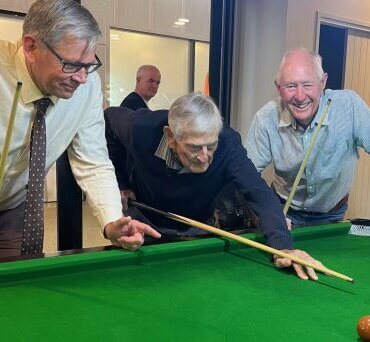 His October 25 centennial started with a small gathering in the billiard room at Te Awa Lifecare, Gerry’s home for the past six years. A quick photo was planned alongside his regular billiard buddies, Richard Seabrook and the former Te Awa general manager Jed Rowlands.