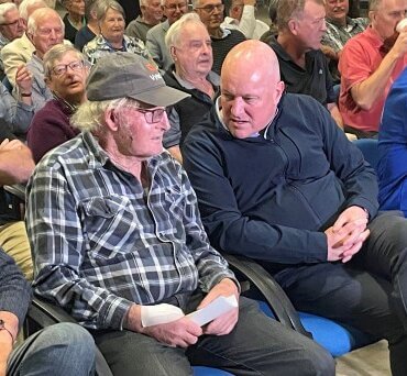 Waipā farmer Bruce Rowe has a discussion with Prime Minister Christopher Luxon at the Federated Farmers Restoring Farmer Confidence Tour.