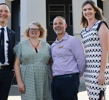 (From left) Cambridge High School principal Greg Thornton, Board of Trustees presiding member Helen Martens, assistant principal Mike Cole and science faculty head Brooke Dillon outside R and D Block, which has just reopened after being weatherproofed and refurbished.