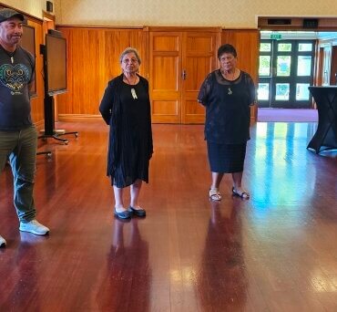 Outside the Victorian Room entrance, Ricky Winikerei used a conch shell to reawaken the ancestors and then accompanied by Haimona and Ramari Samuels, Gladys Tomlinson and Luana Tauroa walked around the hall to make the building safe for contractors.