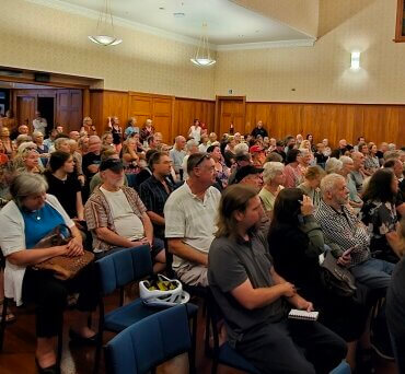 A crowd of about 200 people at the Michael Connett Fluoride Free meeting in Cambridge Town Hall. Photo: Mary Anne Gill