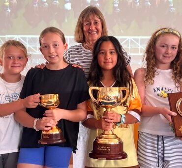Sheila Laxon (back) with (from left) Rosa Christensen, Indie Stewart, Ayla Cholmondeley-Smith, Tika Samuels, Emma Wilkins and Shiah Morris with Laxon’s trainers’ cup, the Lexus Melbourne Cup and a horseshoe worn by Zabeel, signed by Sir Patrick Hogan.