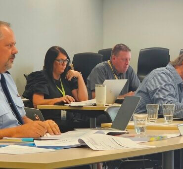Cambridge Raceway operations manager Michelle Thomson, right, gives evidence to the Waipā District Licensing Committee with from left Senior Sergeant David Hall, Waipā licensing inspector Glynn Jones, administrator Nola Stannard and Compliance manager Karl Tutty, commissioners Michael Cameron, Tegan McIntyre, Marcus Gower, Raceway chief executive Dave Branch (partially obscured), solicitor Anna Suckling. Photo: Mary Anne Gill.
