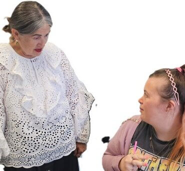 IHC Art Awards visit to Te Awamutu – Stevie Cook with Dame Denise L’Estrange Corbet.