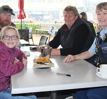 Hayley Tood, son Vincent, and his grandma Joanne Todd speak with Constable Jack Driver at the Coffee with a Cop event in 2017.