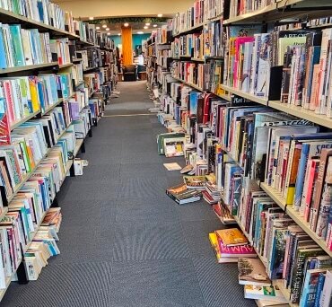 The environment is cramped, with books on the floor and lack of space – but residents continue to join and use the Cambridge library. Photo: Mary Anne Gill