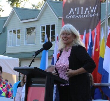 Liz Stolwyk welcomes competitors to the International Breast Cancer Dragon Boat Festival at Victoria Square in Cambridge. Photo: Mary Anne Gill