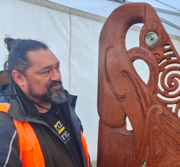 Bodie Tihoi Huitoroa-Taylor telling the story about the special taonga gifted by Ngāti Korokī-Kahukura and Ngāti Hauā mana whenua that he carved for the Hautapu Substation. Photo: Mary Anne Gill