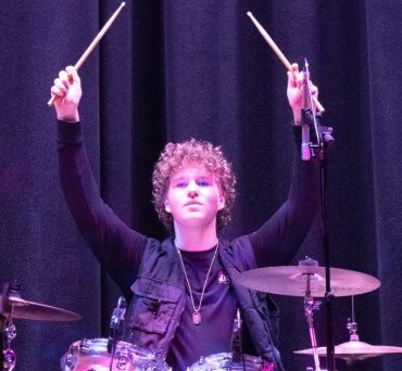 Mitch Denne drums on the St Peter’s School stage last year and will be back there today to play again. Photo: Supplied.