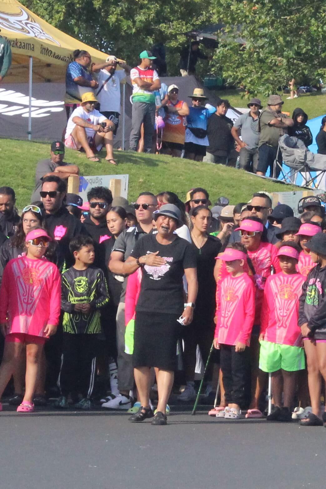 Horouta Waka Hoe Club’s Cynthia Sidney led the visiting waka ama teams into the pōwhiri at Lake Karāpiro.