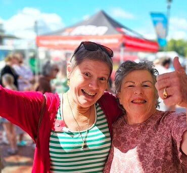 Brenda Broderick, left and Janice Sykes celebrate at the Cambridge Autumn Festival.