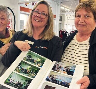 Cambridge Hospice Shop manager Justine Webb-Elliott, centre, flanked by Cambridge Blind and Low Vision Support Group president Marilyn Kennedy, left, and group secretary Karen Voss, showing some of the images in the scrapbook. Photo Viv Posselt