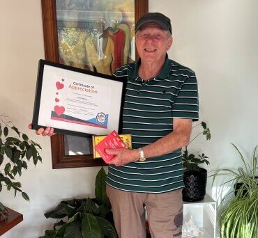 Peter Martin with the certificate presented to him by Neighbourhood Support.