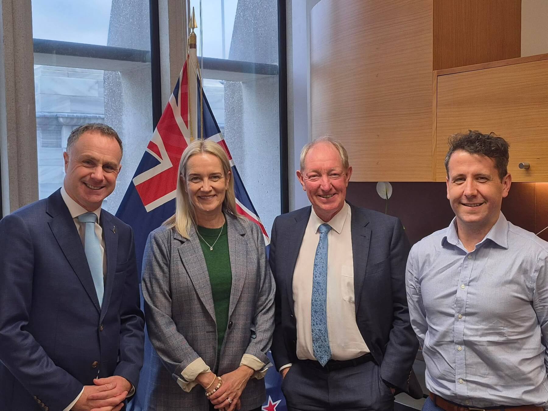 Susan O’Regan on Tuesday with Local Government Minister Simon Watts at the Beehive with Nick Smith and Campbell Barry as part of the Electoral Reform Working Group. Photo: Supplied
