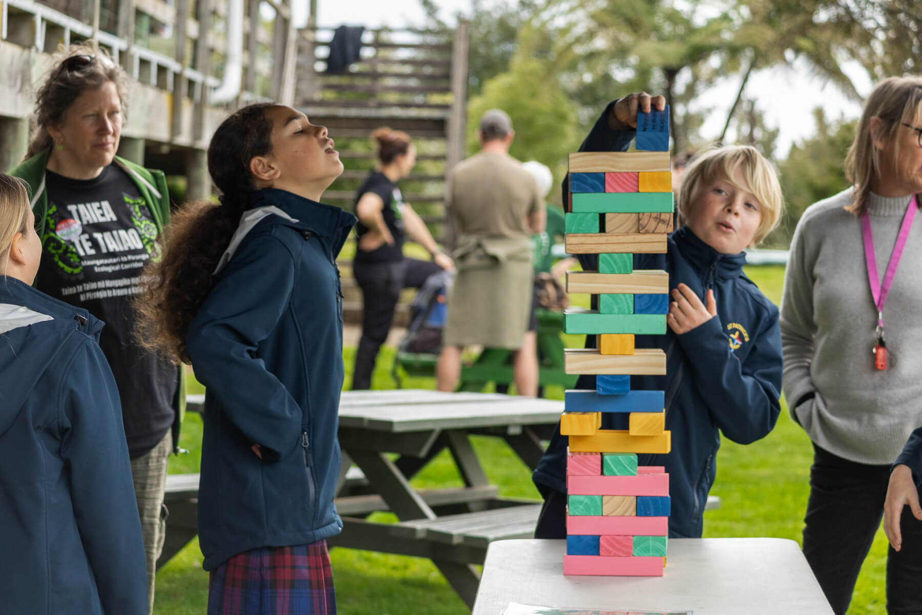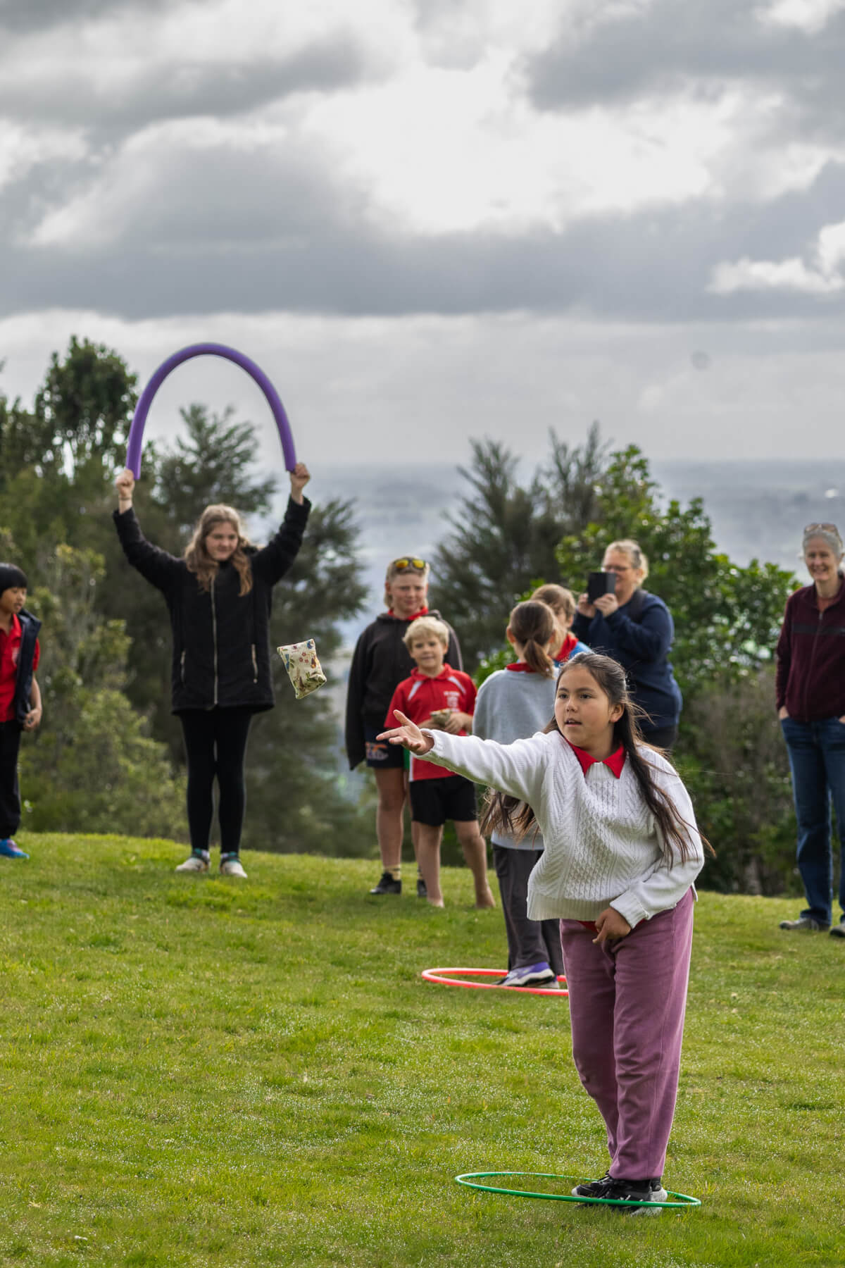 Te Pahū School students enjoying the games at Pirongia Forest Park Lodge. Photo: Rebecca McDaid