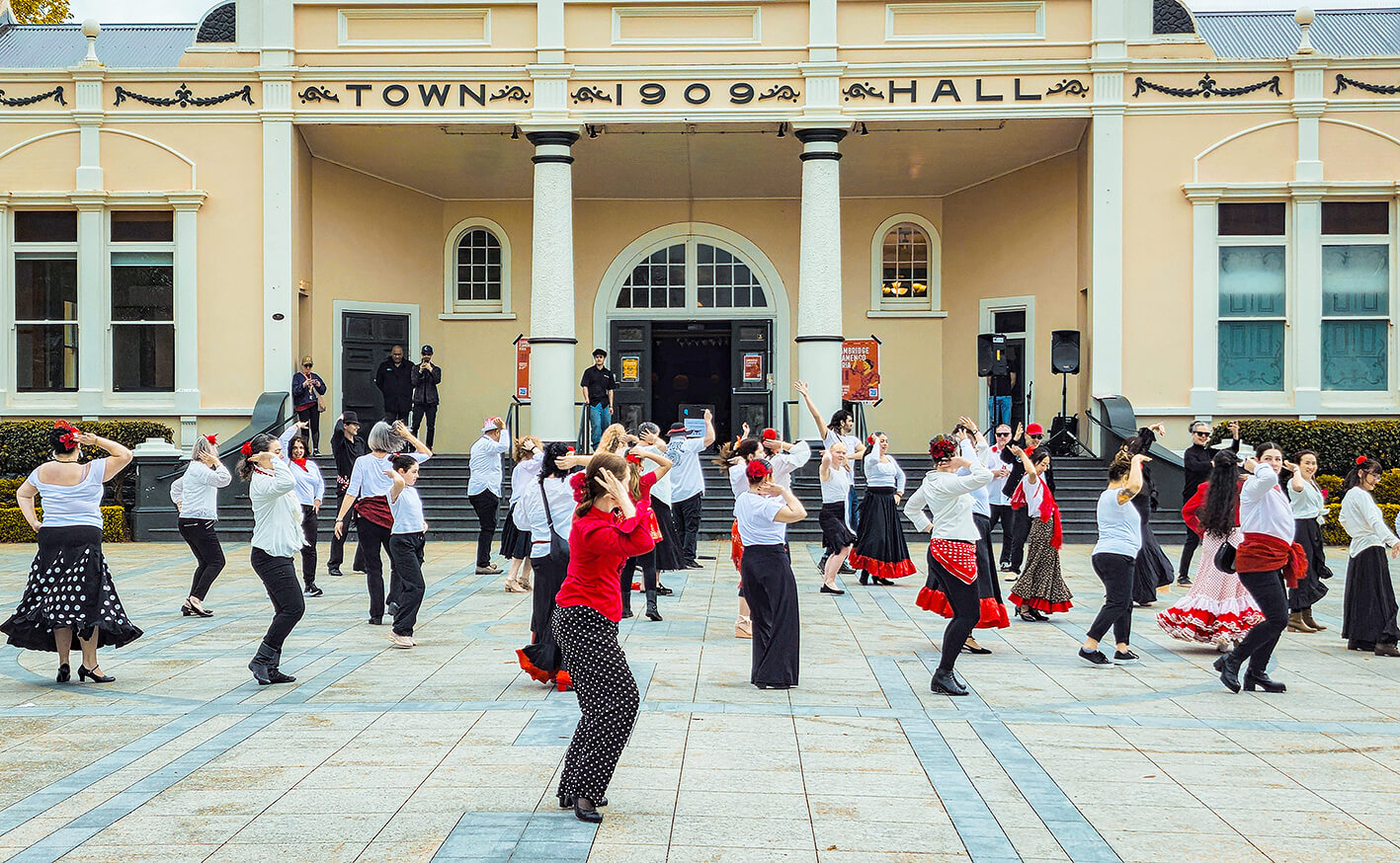 A touch of Spain was evident in Cambridge on Saturday in the form of dance and music in front of the Town Hall. The six-hour party included a “flamenco flash mob” servings of paella, a guitar making demonstration and craft work. Photo: Michael Jeans.