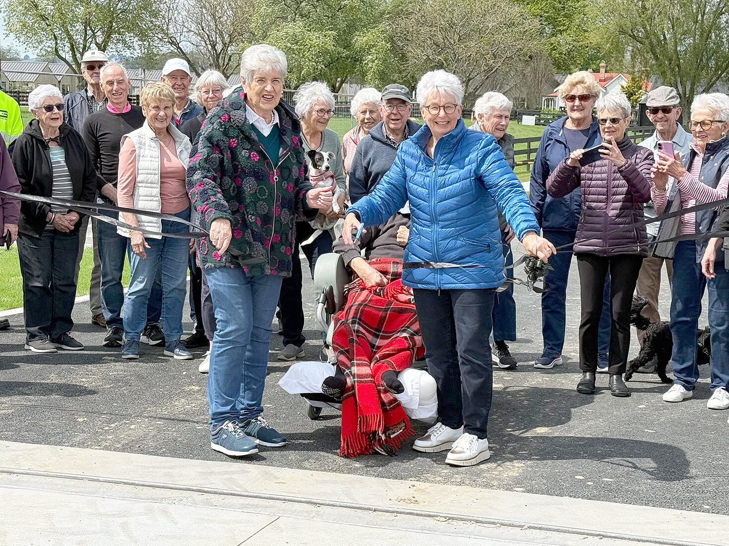 Long-time Te Awa Lifecare residents Barbara Edgecombe (left) and Gayle MacMillan cut the ribbon to officially open the retirement village’s new entrance on Arikura Lane last week.