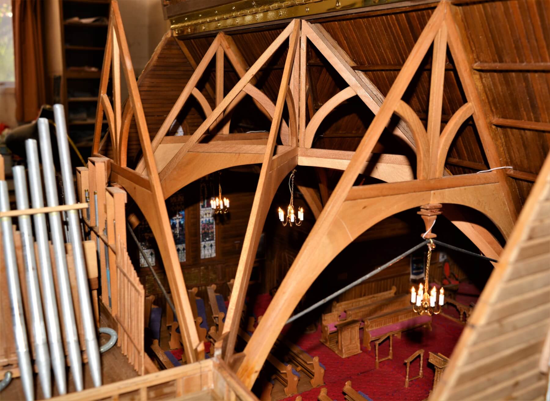 He managed to fit in 1376 of around 2000 pipes channelling sound from the church’s pipe organ. The main altar is made up of 238 pieces and most of more than 24 pews have 49 pieces each. Extraordinary detail went into replicating the carved wood around the pulpit; his tiny piano, miniature bishop’s chair, soaring roof beams and tiny working chandeliers are genius.