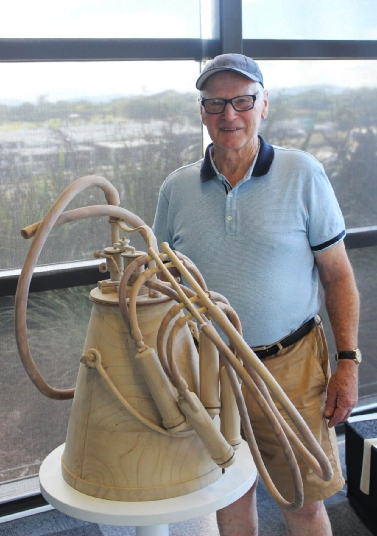 Roger Dean with his replica wooden milking system that took second place in the 2019 WoodFest national competition. Photo: supplied