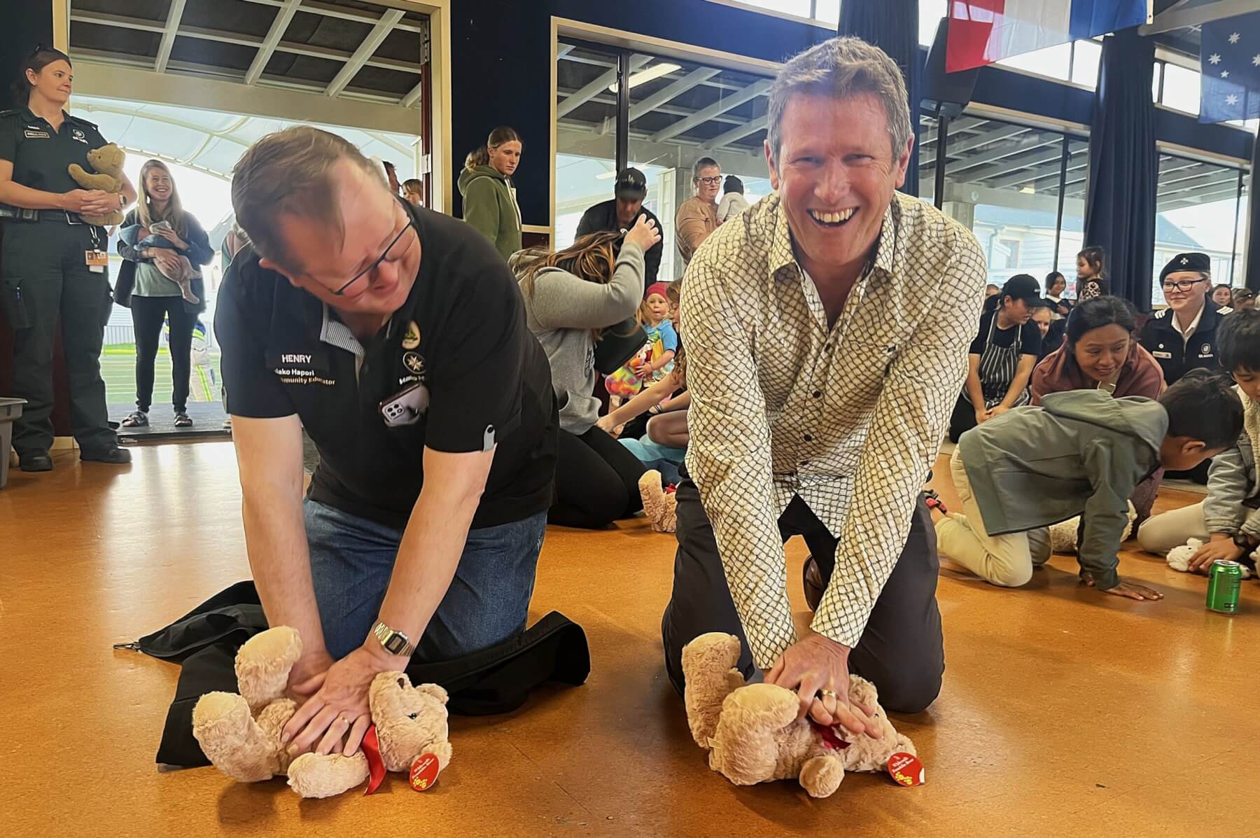 With the ‘great teddy rescue’ happening on the evening prior to his win in the local body elections, the then school principal Mike Pettit thanked organisers and attendees for their support, gamely joining in the one-minute CPR challenge alongside HeartSafe’s Henry Strong.