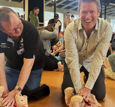 With the ‘great teddy rescue’ happening on the evening prior to his win in the local body elections, the then school principal Mike Pettit thanked organisers and attendees for their support, gamely joining in the one-minute CPR challenge alongside HeartSafe’s Henry Strong.