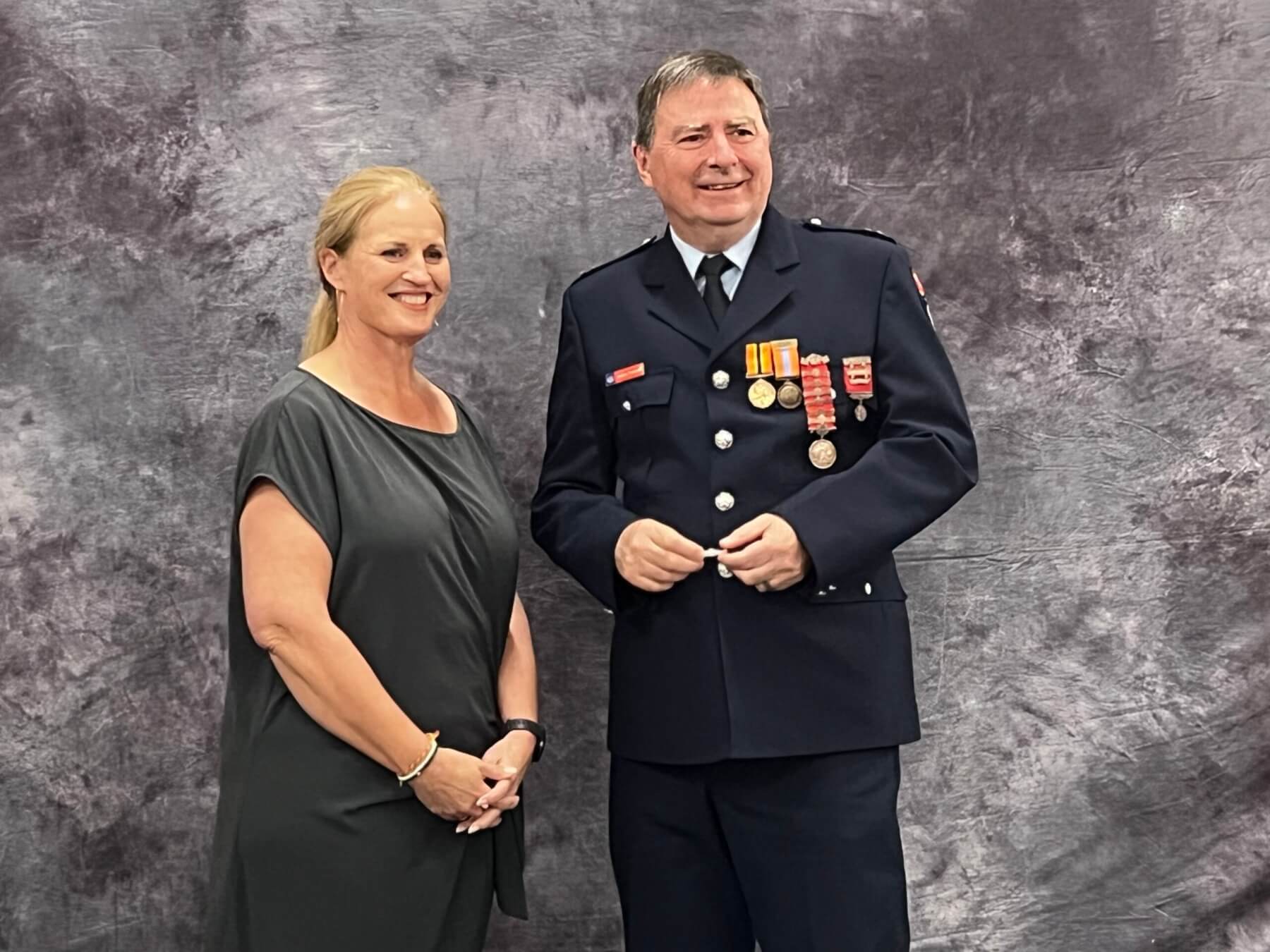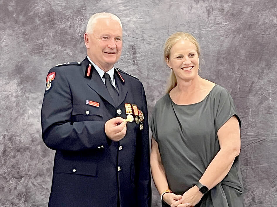 Senior firefighter Andy Fairhall, pictured with Taupō MP Louise Upston, was awarded a 2-year silver bar for 19 years’ service. Photo: Viv Posselt