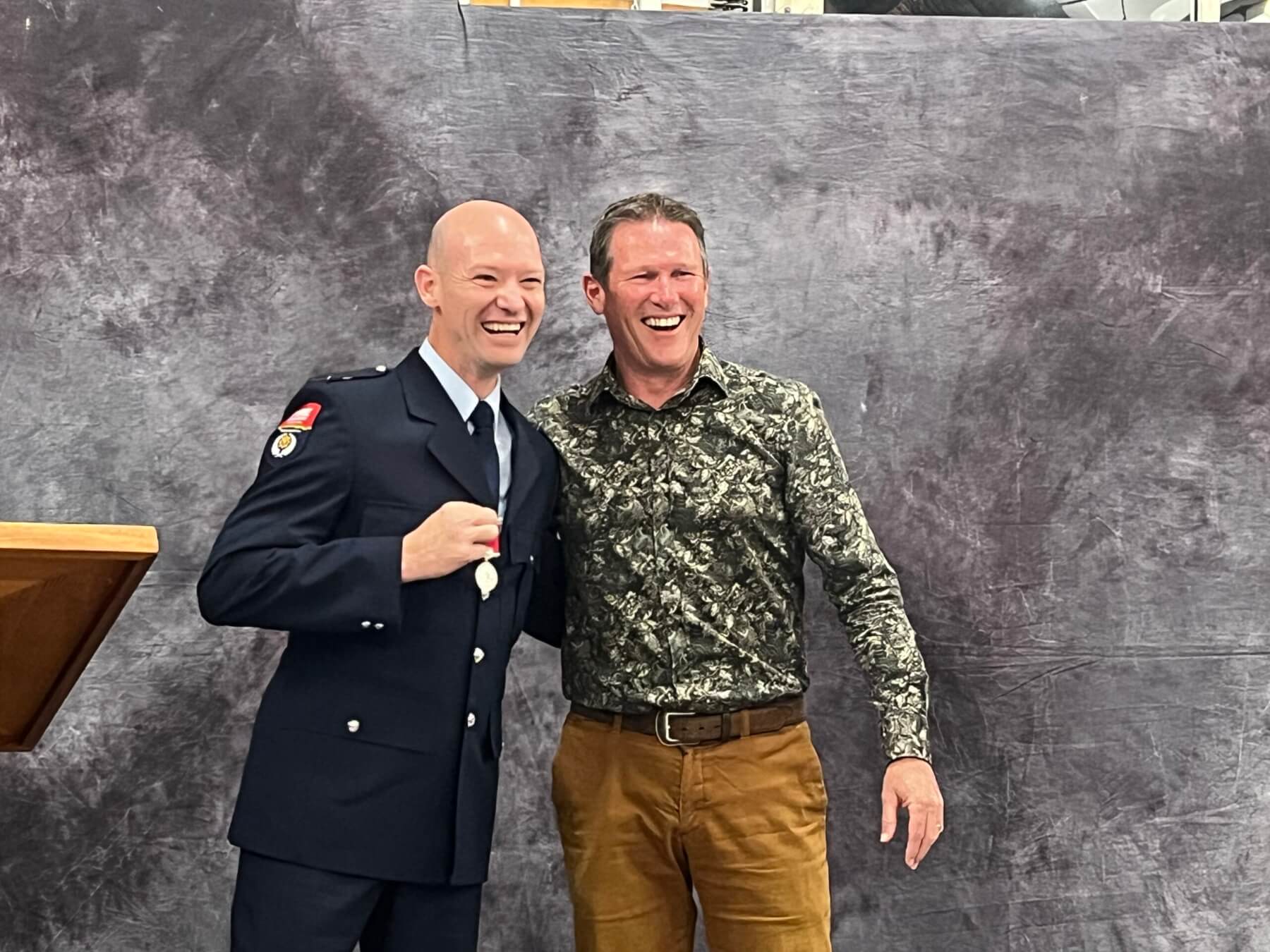 Sharing a joke with Mike Pettit is qualified firefighter Bruce Bester, who received a 5-year service medal. Photo: Viv Posselt