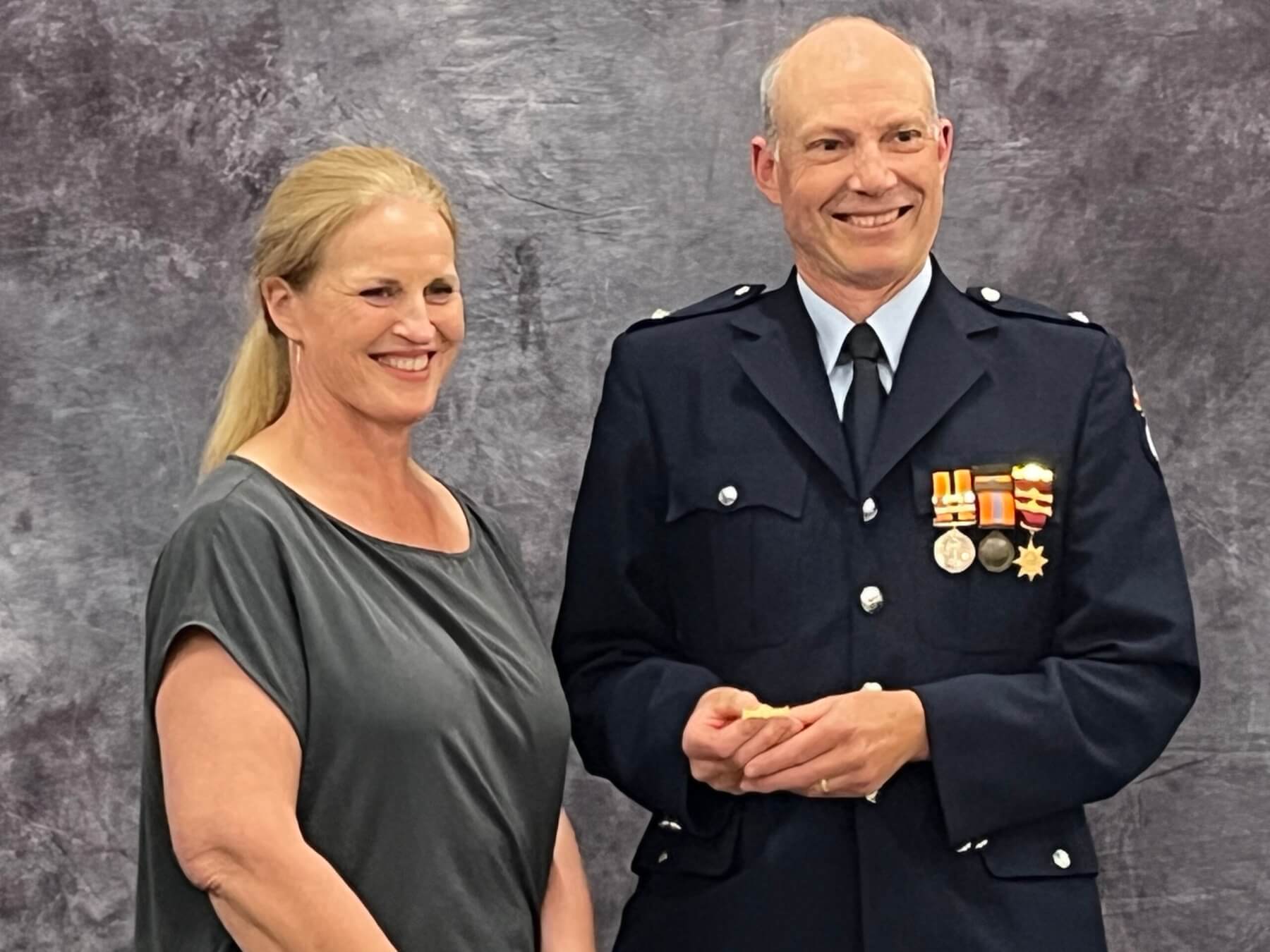 Senior firefighter Andy Fairhall, pictured with Taupō MP Louise Upston, was awarded a 2-year silver bar for 19 years’ service.