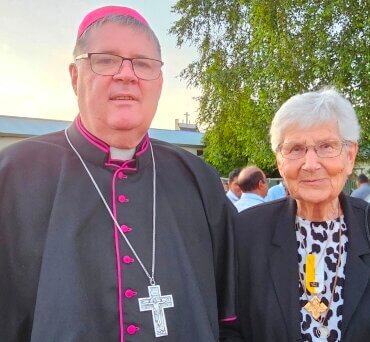 Betsy Reymer with Catholic Bishop Richard Laurenson