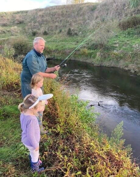 Michael Bennett and daughters Olivia and Abby fishing for Koi carp.