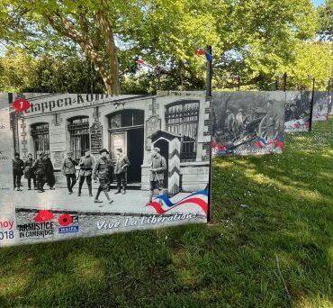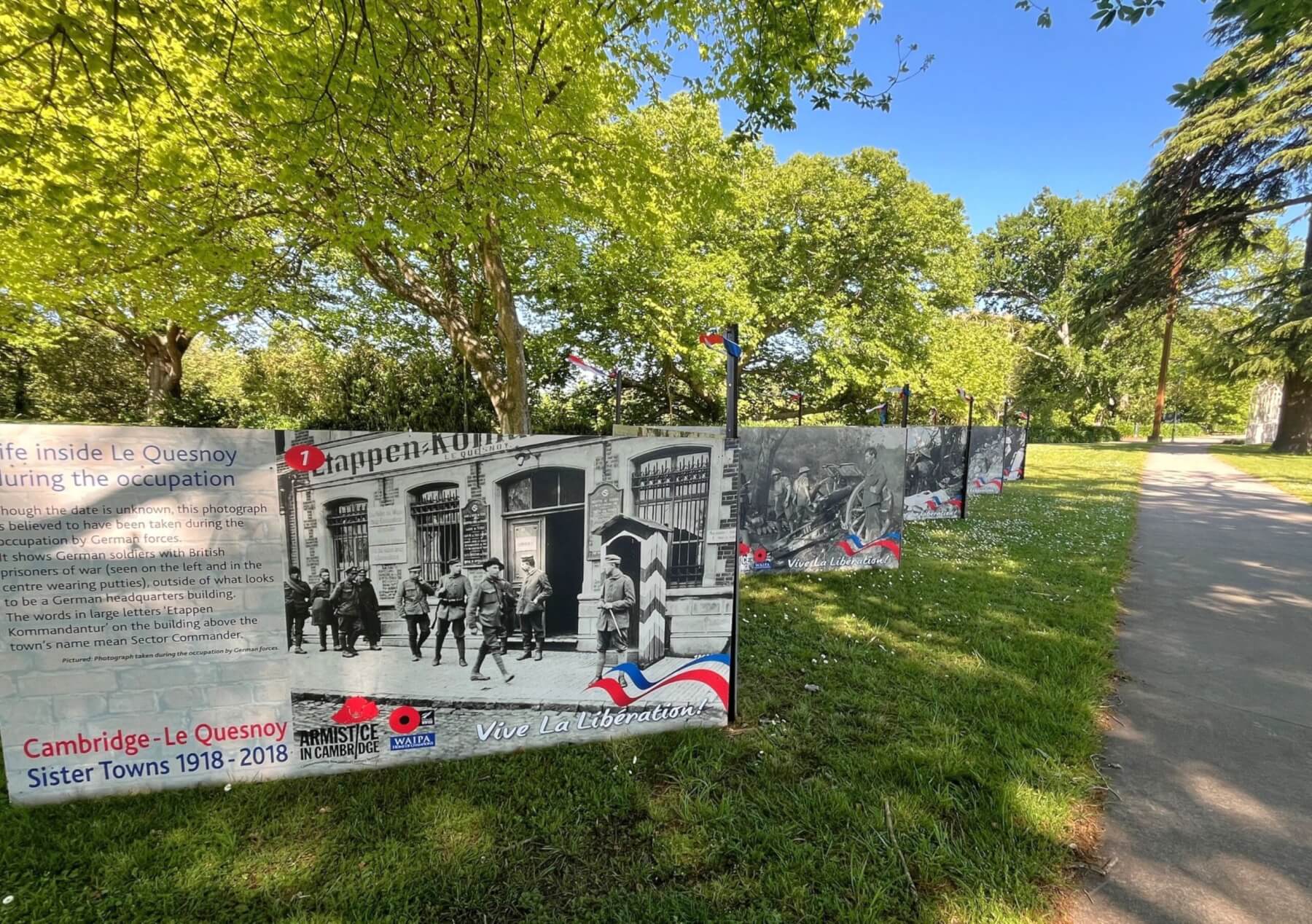 A series of story boards displayed under the trees tells the story of the Le Quesnoy liberation.