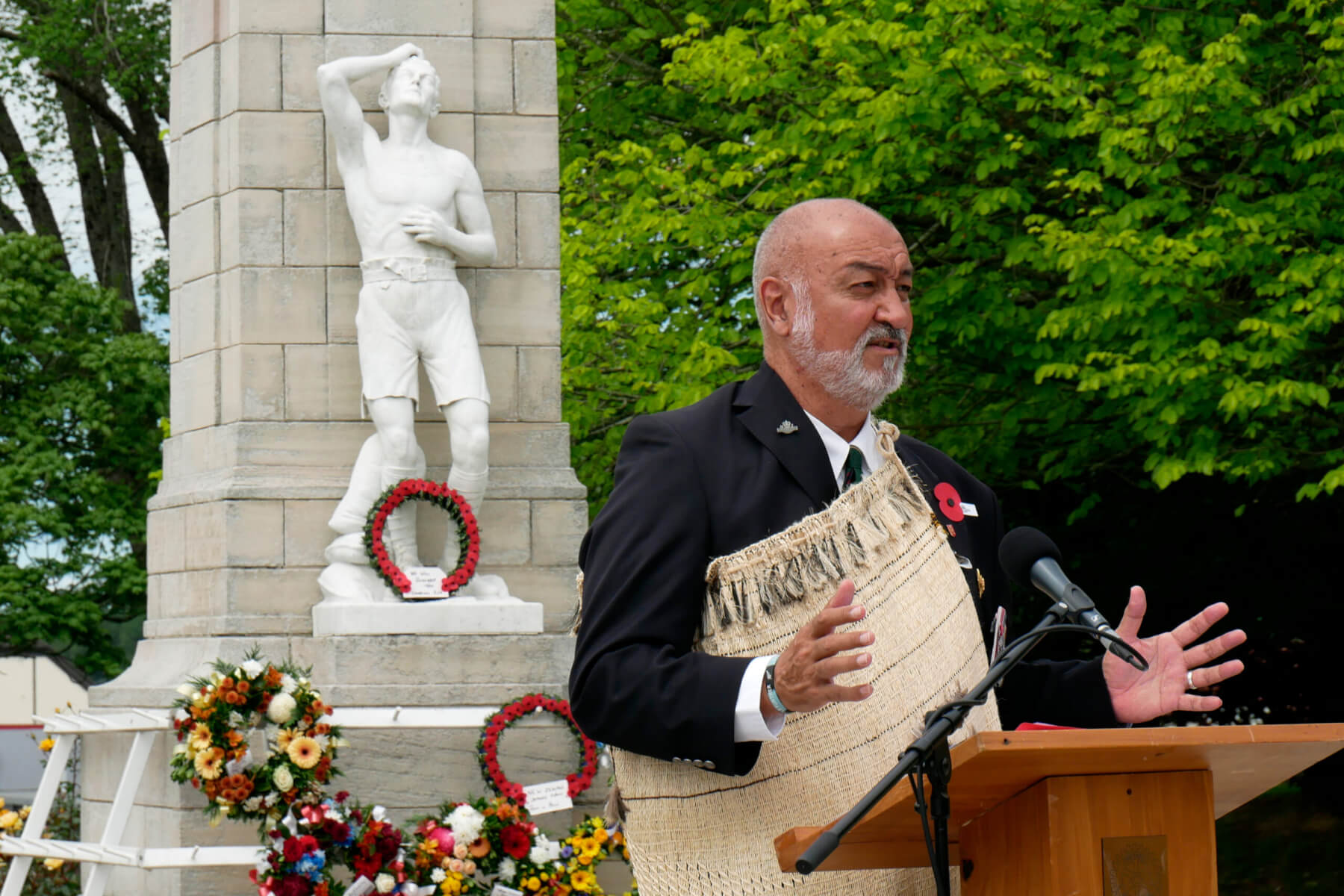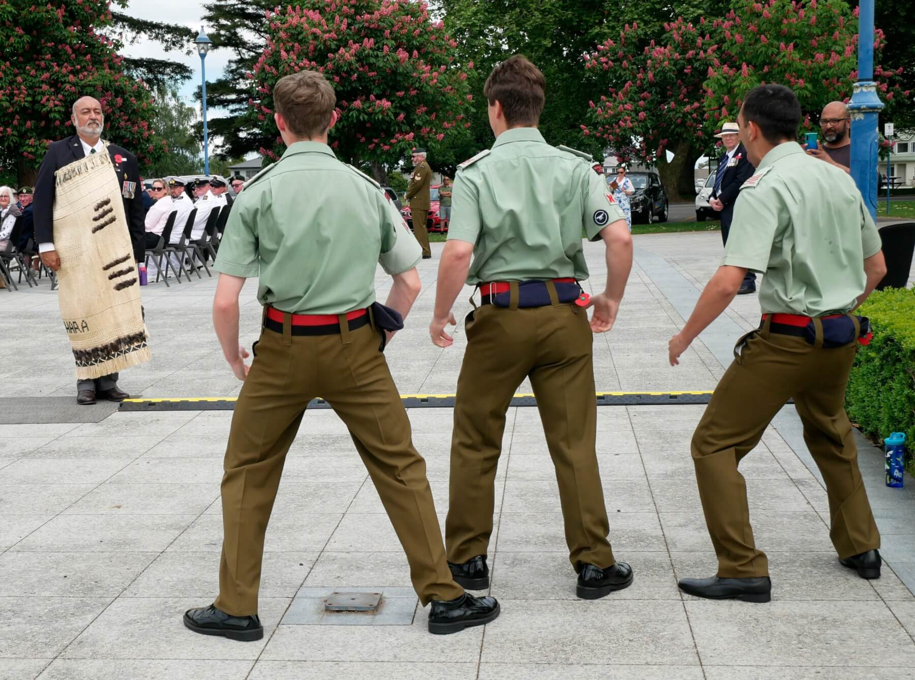 New RNZRSA national president, Cambridge’s Tony Hill, being welcomed with a haka at this month’s Remembrance Sunday civic ceremony, performed by members of the Hamilton city cadet unit. Photo: Michael Jeans.