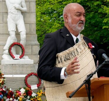New RNZRSA national president, Cambridge’s Tony Hill, being welcomed with a haka at this month’s Remembrance Sunday civic ceremony, performed by members of the Hamilton city cadet unit. Photo: Michael Jeans.