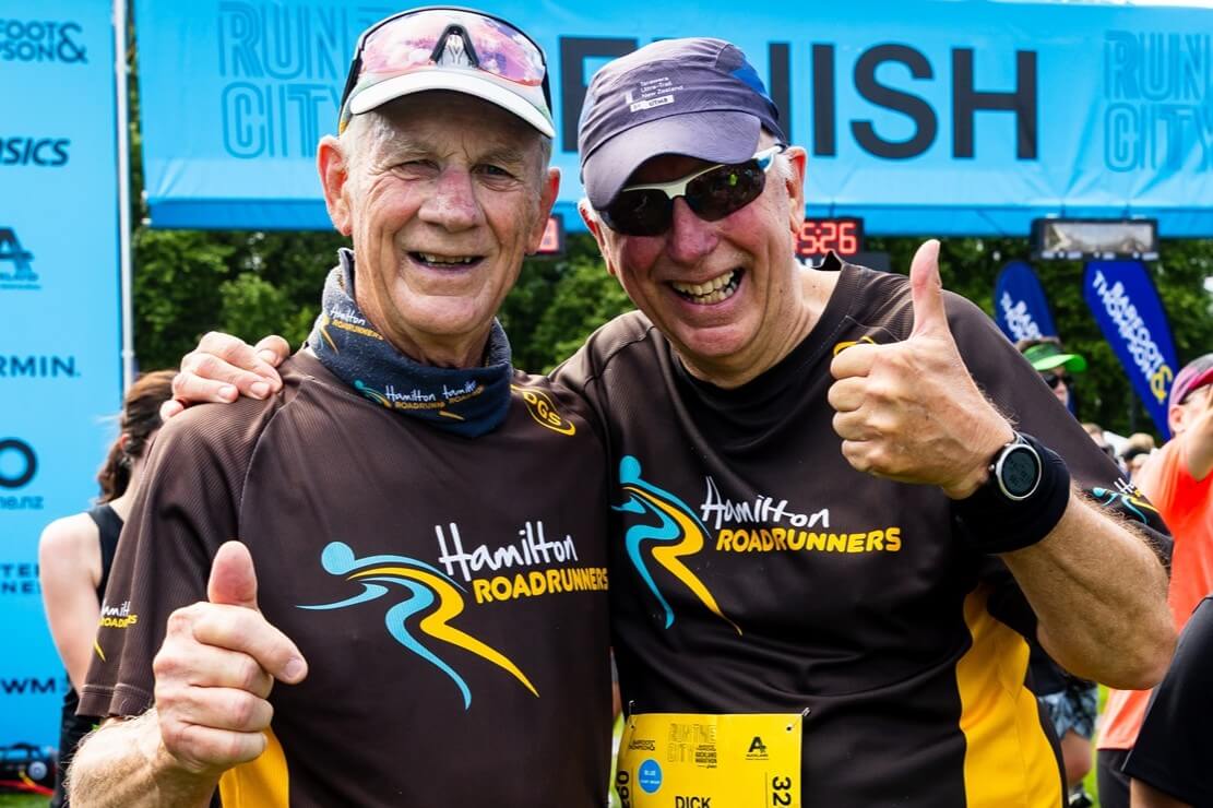 Cambridge businessman Dick Breukink (right) and friend Rod Gill celebrate after completing the half marathon. Photo: Alisha Lovrich