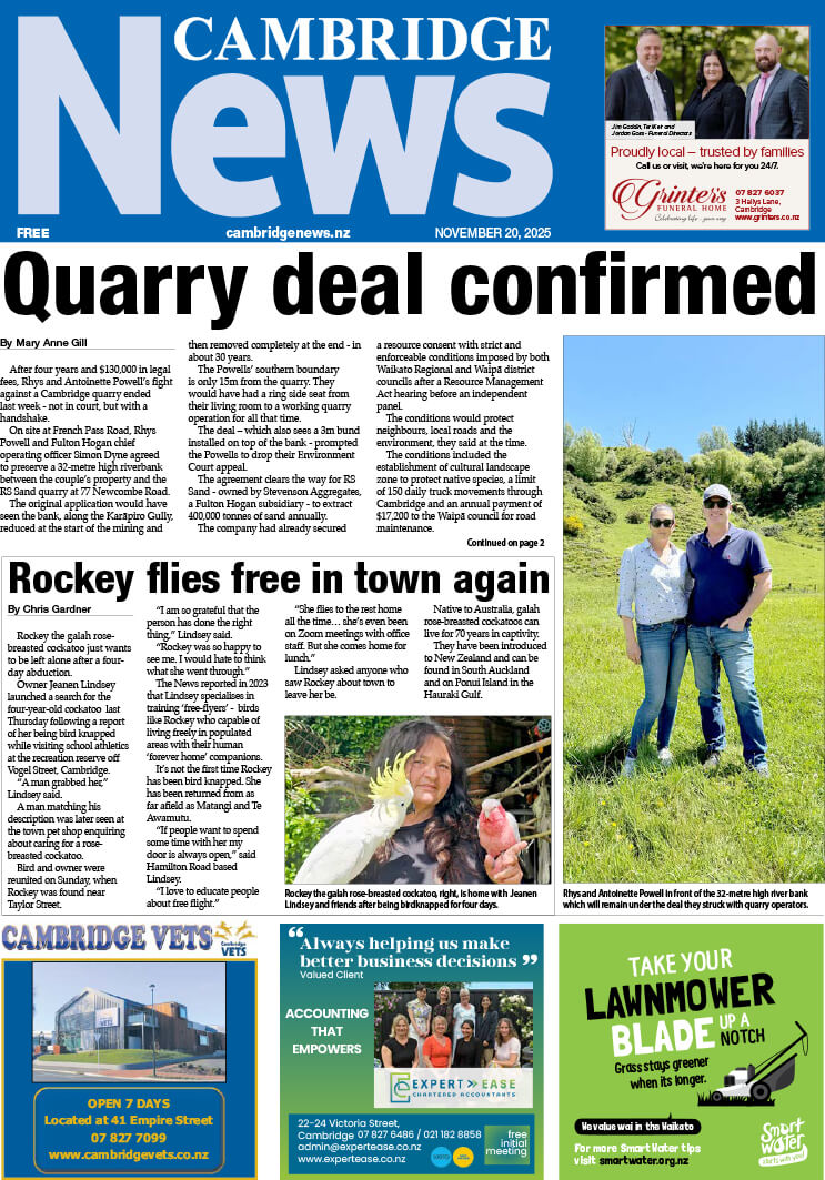 The conditions included the establishment of cultural landscape zone to protect native species, a limit of 150 daily truck movements through Cambridge and an annual payment of $17,200 to the Waipā council for road maintenance.