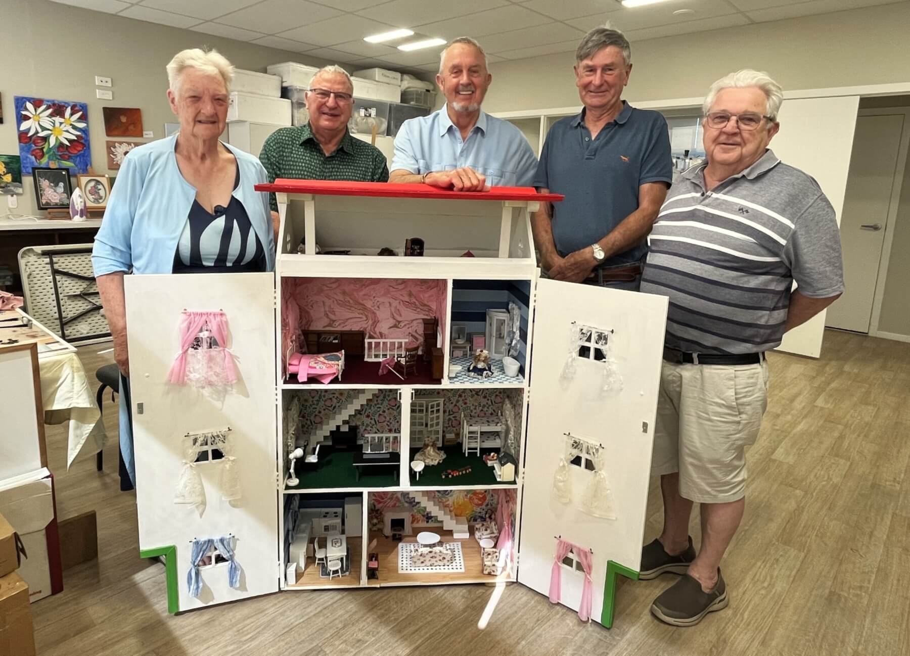 Some lucky little person could soon be the recipient of a three-storey doll’s house made by blokes at the Cambridge Menzshed and furnished by Cambridge Resthaven resident Alison Hucke.