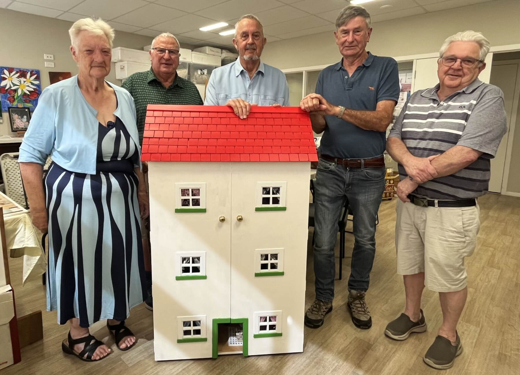 The doll’s house with doors closed, pictured with decorator Alison Hucke, Friends of Resthaven Foundation chairman Don Harris, Menzshed members and builders Eric Hill and Peter Moore, and Friends of Resthaven Foundation’s Alan Wellington. Photo: Viv Posselt