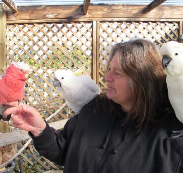 Jeanen Lindsey talking about finding the right home for her rescued birds with Rockey, Charlie and Ben. Photo: Benji Allen.