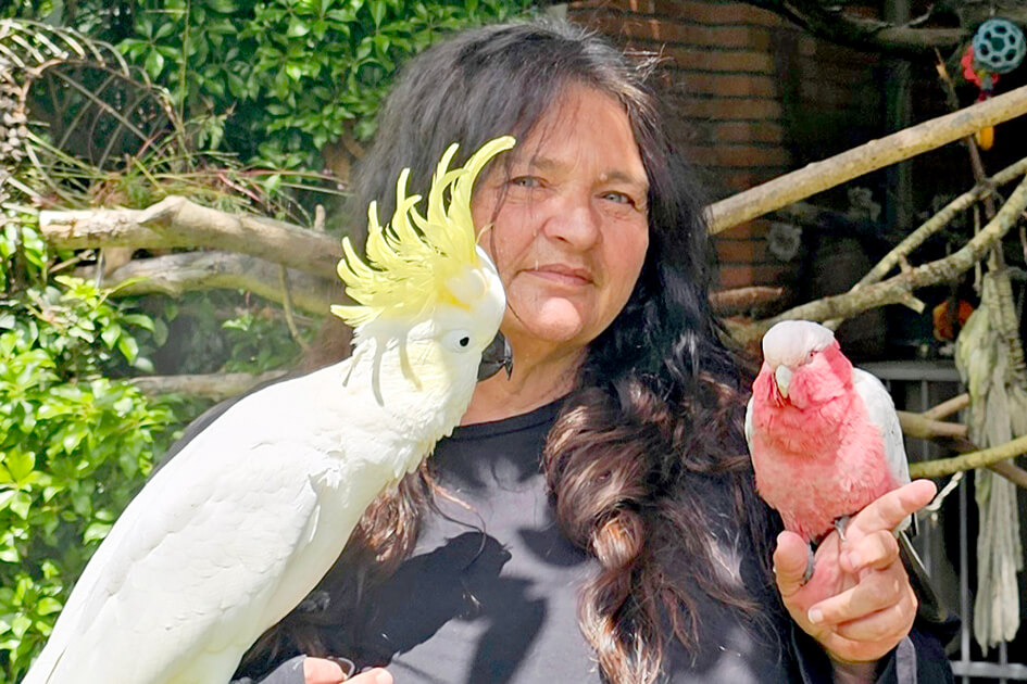 Rockey the galah rose-breasted cockatoo, right, is home with Jeanen Lindsey and friends after being birdknapped for four days