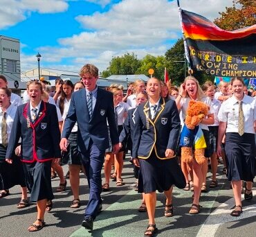 Cambridge High School lead the way at the head of the Maadi Cup parade through the streets.