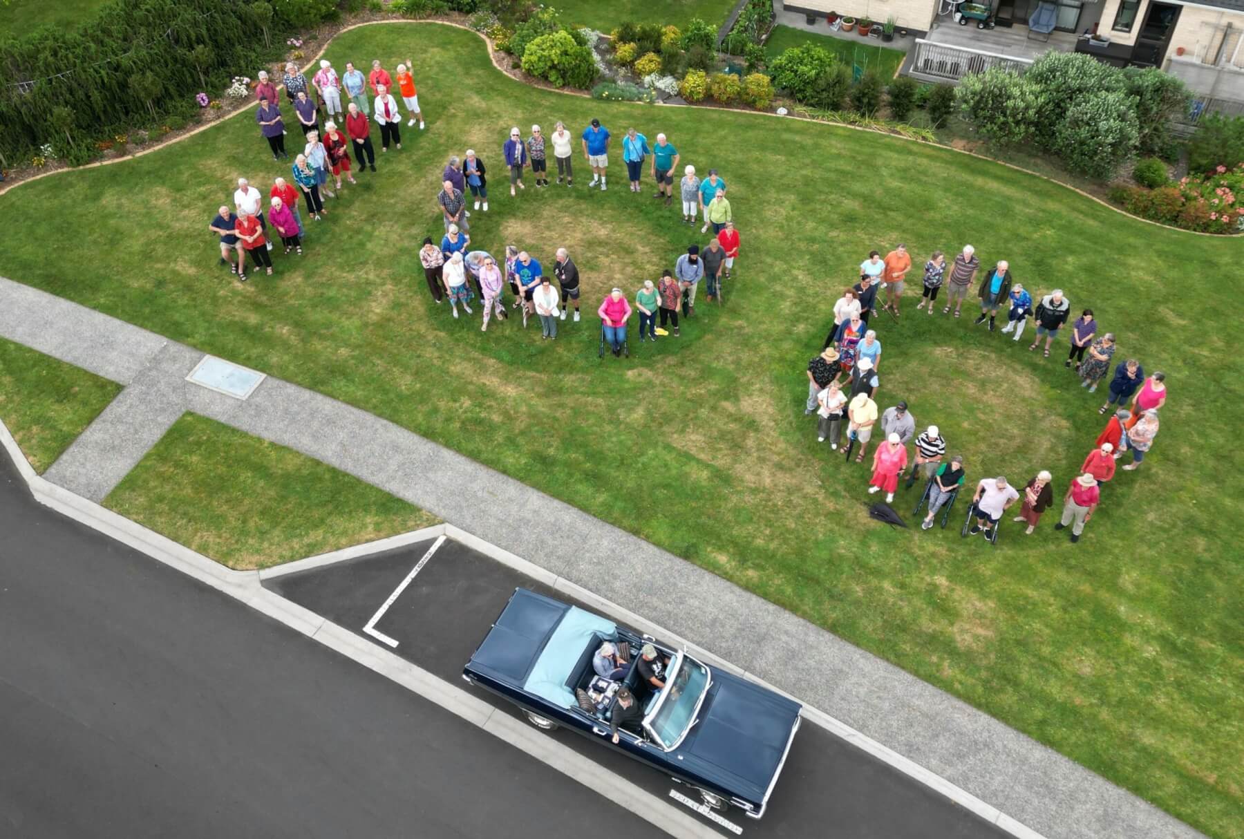 Reid’s birthday celebrations began days earlier when numerous fellow residents spread out across a giant 1-0-0 marked out on the lawn to salute him as he was driven up in a flash 1967 Ford Mercury, owned by resident Ian Cunningham. Capturing it all from above was drone photographer and Arvida project manager, Gane Heslop.