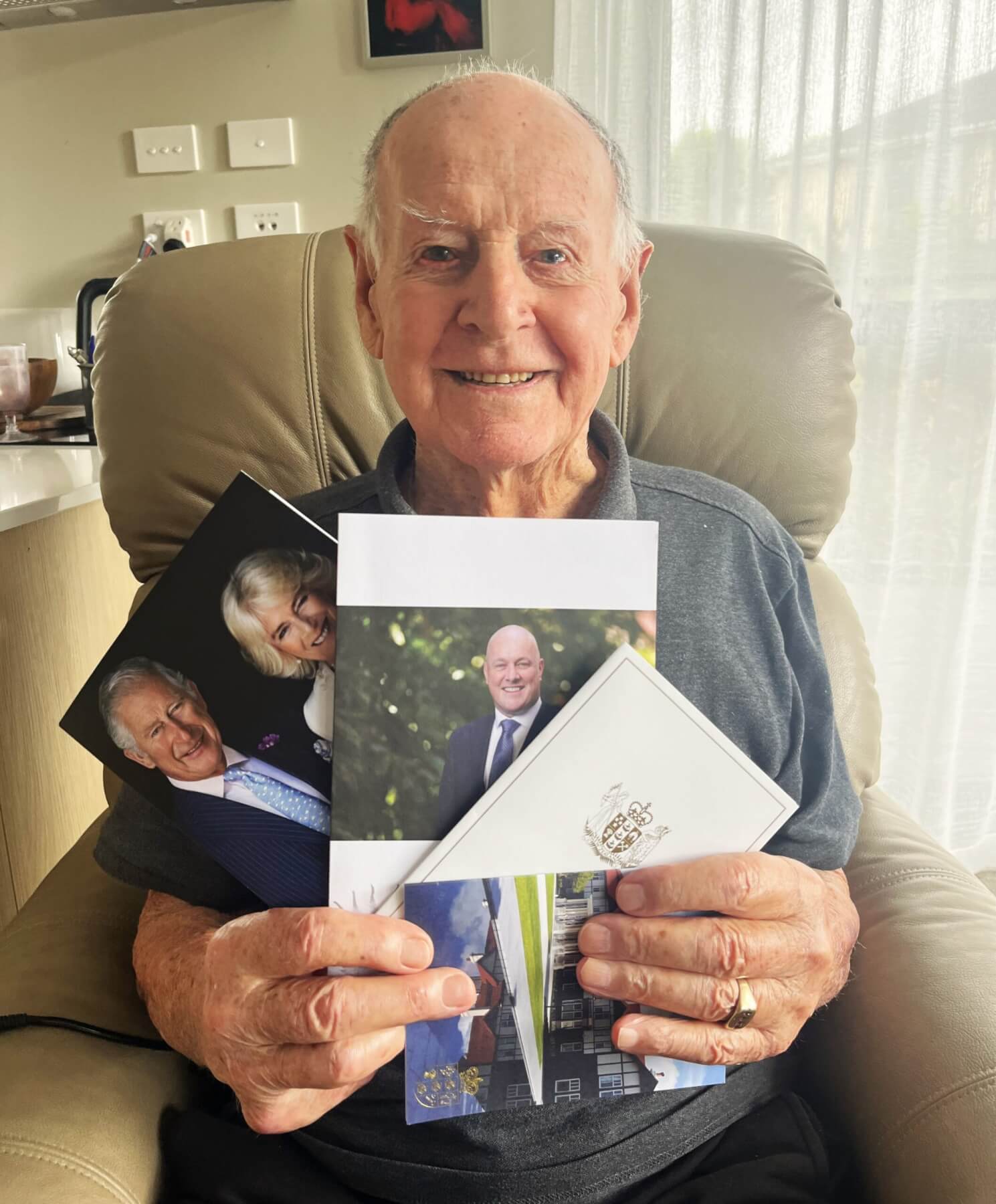 Reid Calder with a fistful of 100-year birthday cards from luminaries near and far. Photo: Viv Posselt