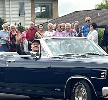 Reid’s birthday celebrations began days earlier when numerous fellow residents spread out across a giant 1-0-0 marked out on the lawn to salute him as he was driven up in a flash 1967 Ford Mercury, owned by resident Ian Cunningham. Capturing it all from above was drone photographer and Arvida project manager, Gane Heslop.