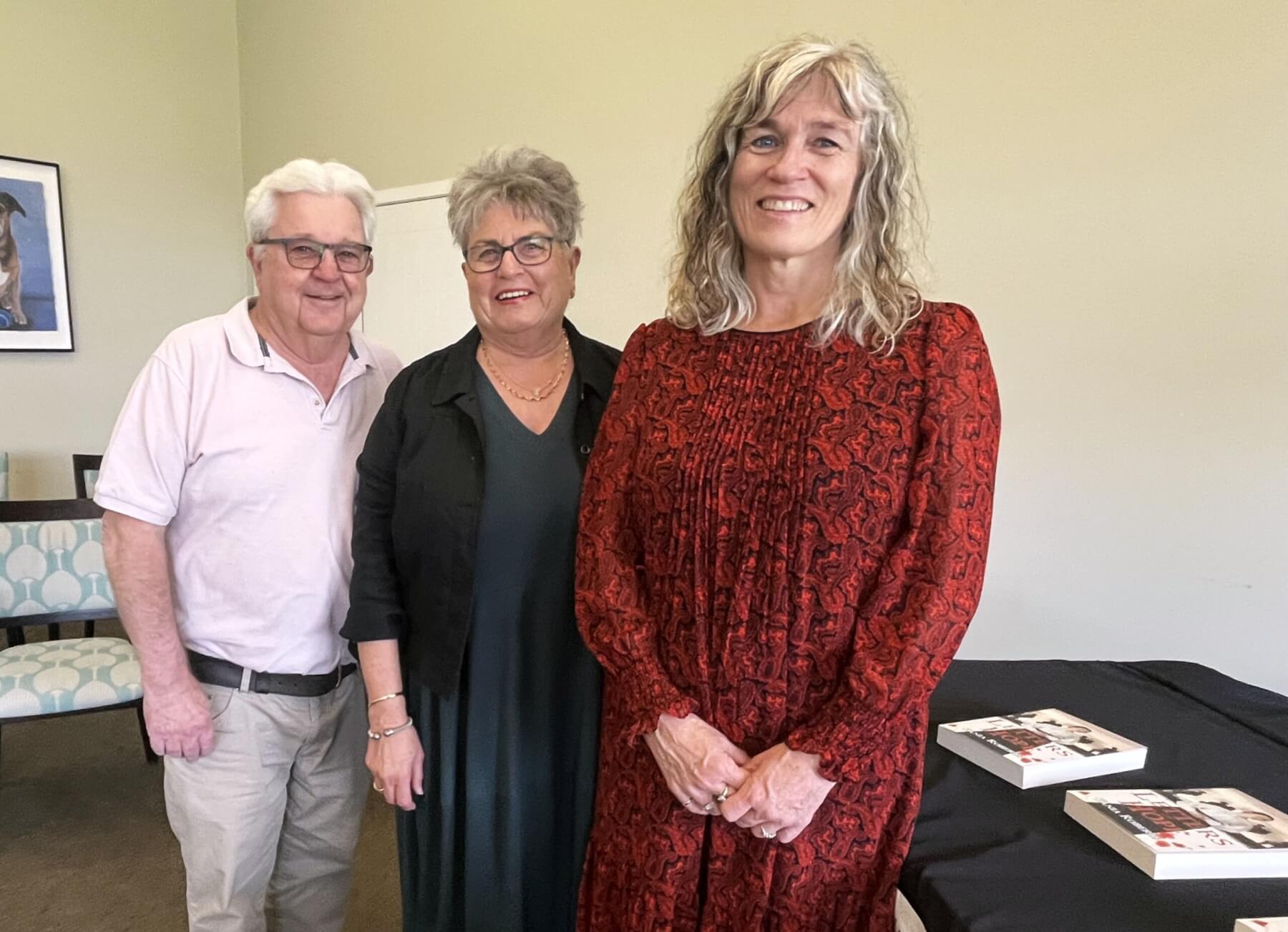 Cambridge-Le Quesnoy Friendship Association’s Heather Wellington, centre, with her husband Alan and the new book’s author,