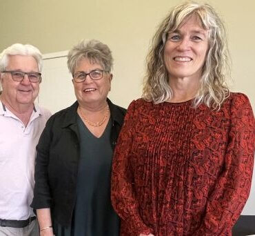 Cambridge-Le Quesnoy Friendship Association’s Heather Wellington, centre, with her husband Alan and the new book’s author, Tania Roberts. Photo: Viv Posselt